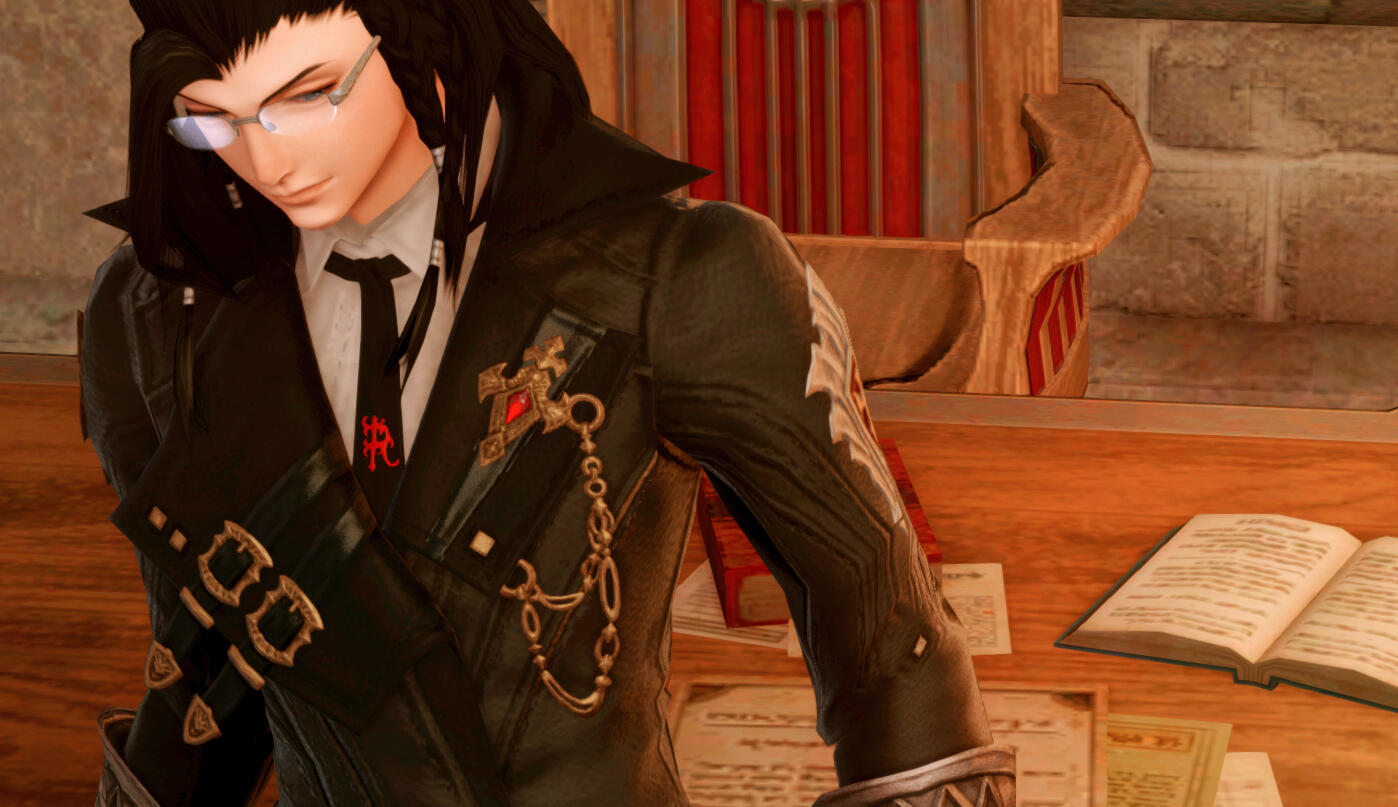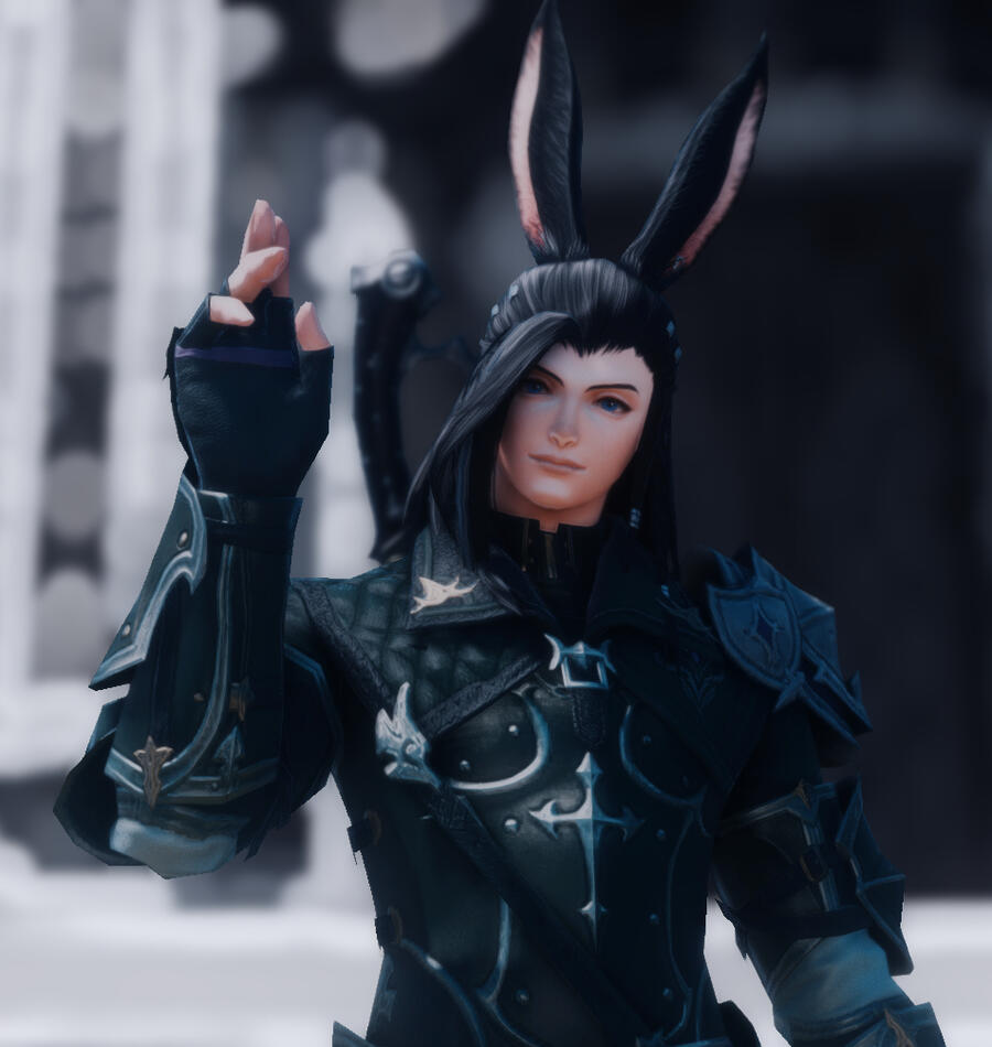Canon Jobs: Samurai, Gunbreaker.Appearance: Bright blue eyes, dark hair woven into simple braids. Long, hare-like ears. An unremarkable but kind face and a bright smile. Medium height, strong figure. Often wearing black colors, from a long coat when working to a simpler, casual shirt when off-duty.Personality Quirks: Affable and intelligent. Possessed of a unique cunning and easy-going nature. Disregards rules and regulations when there’s something in the way of getting the job done.Aether: Aura reads as warm, mountain spring blue, ebbing and flowing like a tide.